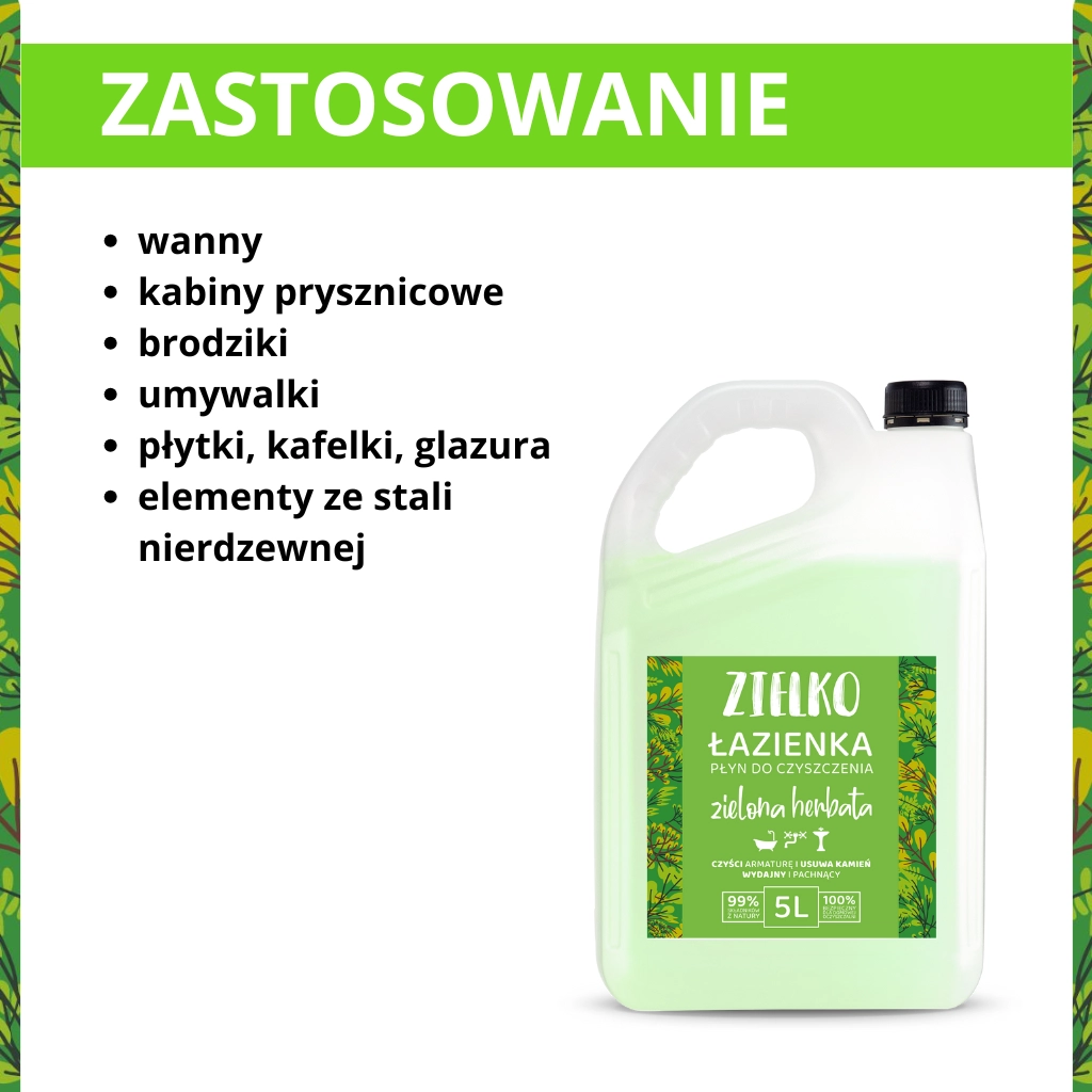 Pachnący zieloną herbatą płyn do ZIELKO skutecznie czyści i odświeża łazienkę, wypełniając ją niezwykle przyjemnym aromatem. Błyskawicznie radzi sobie z kamieniem i wszelkimi osadami na armaturze oraz ceramice, pozostawiając lśniące powierzchnie bez smug i zacieków. Jego specjalnie opracowana formuła zapobiega osadzaniu się kurzu, co umożliwia łatwiejsze utrzymanie czystości na dłużej. Bezpieczny i skuteczny skład, zawierający 5-<15% amfoteryczne związki powierzchniowo czynne oraz unikalną kompozycję zapachową, zapewnia nie tylko nieskazitelną czystość, ale i przyjemny, odświeżający aromat zielonej herbaty. Czyszczenie łazienki z ekologicznym płynem ZIELKO jest nie tylko przyjemne i skuteczne, ale również przyjazne dla naszej planety.