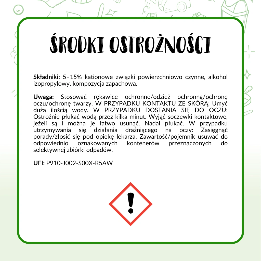 Dozowanie:Składniki: <5% kationowe związki powierzchniowo czynne, alkohol izopropylowy, kompozycja zapachowa (Citronellol, Benzyl Salicylate, Hexyl Cinnamal)