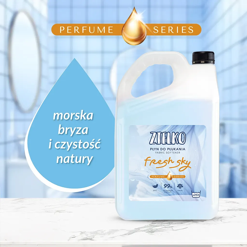 Płyn do płukania z linii Zielko otula tkaniny lekkim aromatem inspirowanym morską bryzą, który przywodzi na myśl powiew czystego, chłodnego powietrza. Dzięki temu ubrania po każdym praniu nie tylko są miękkie, lecz także emanują subtelną, długo utrzymującą się świeżością, która poprawia komfort noszenia i dodaje przyjemnych wrażeń z użytkowania.