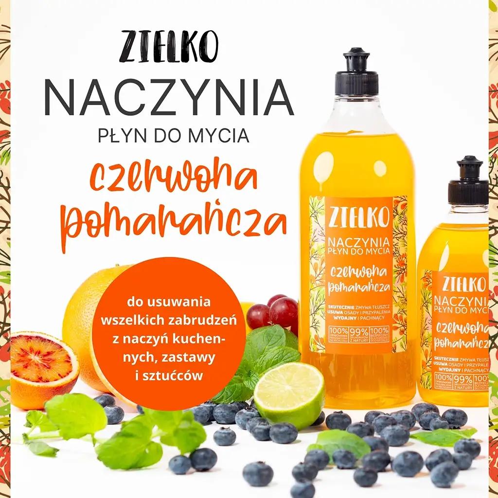 Płyn do mycia naczyń ZIELKO to niezastąpiony produkt w Twojej kuchni. Dostępny w pojemnościach 500 ml i 1 l, o zachwycającym zapachu czerwonej pomarańczy. Płyn nie tylko skutecznie usuwa tłuszcz, brud oraz przypalenia z naczyń kuchennych, zastawy i sztućców, ale jednocześnie jest niezwykle delikatny dla wrażliwej skóry dłoni, nie powodując jej wysuszenia. Jest również bezpieczny dla powierzchni mających kontakt z żywnością, dlatego bez obaw możesz stosować go w swojej kuchni. Dzięki specjalnie opracowanej formule, płyn jest wyjątkowo wydajny, co oznacza, że wystarczy niewielka ilość, aby skutecznie umyć dużą ilość naczyń. Posiada niezwykle przyjemny, orzeźwiający aromat czerwonej pomarańczy, który wypełni całą kuchnię uczuciem czystości. Płyn do mycia naczyń ZIELKO sprawi, że codzienne mycie naczyń stanie się niezwykle łatwe, szybkie i przyjemne.