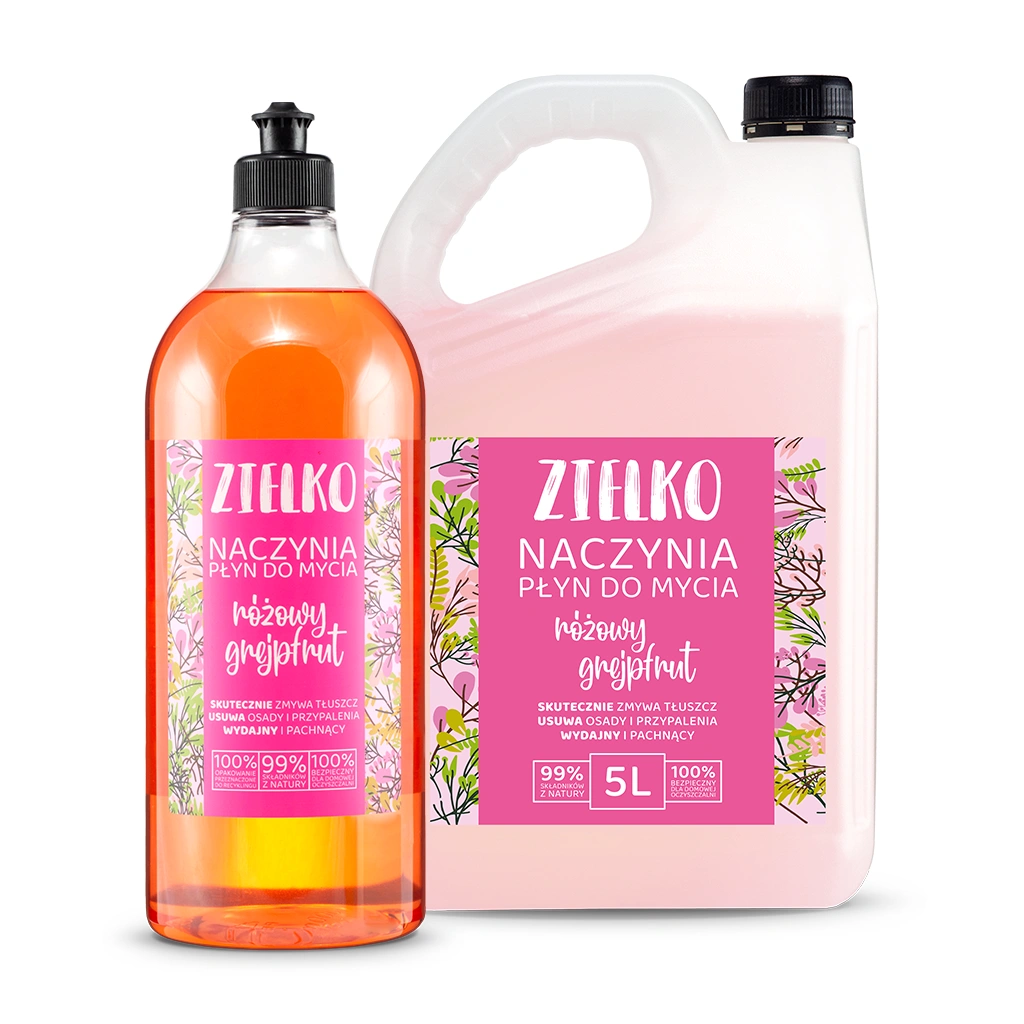 Jeśli zmywasz często i chcesz połączyć wygodę z oszczędnością, wybierz zestaw ZIELKO Płyn do mycia naczyń RÓŻOWY GREJPFRUT (1 l + refill 5 l). Większa butelka 1 l świetnie sprawdza się na co dzień, a uzupełnienie 5 l pozwala utrzymać stały zapas płynu w domu lub lokalu i ogranicza częste kupowanie kolejnych opakowań.