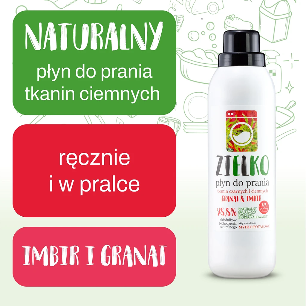 Naturalny płyn na bazie mydła potasowego dedykowany do prania tkanin czarnych i ciemnych o wyjątkowym zapachu granatu i imbiru. Sprawdzona receptura oraz ekologiczny skład płynu pomagają usuwać plamy, nie niszcząc tkaniny. Został stworzony do stosowania zarówno podczas prania ręcznego oraz w pralce. Sprawia, że ubrania stają się czyste i przyjemne w dotyku. Skuteczne pranie w temperaturze 30°- 60°C.